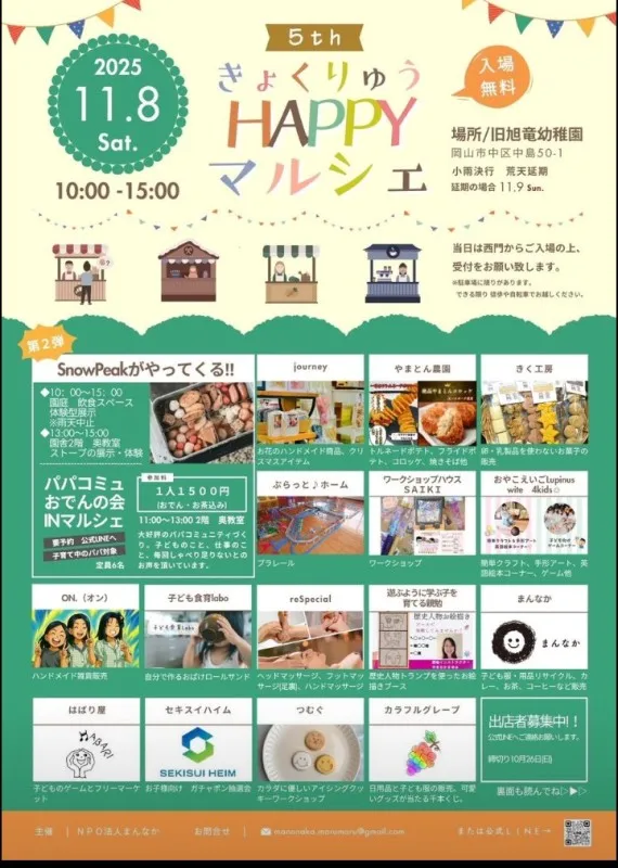 岡山市の卵・乳製品を使わないお菓子【きく工房】イベント11/8「きょくりゅうHAPPYマルシェ」出店 イベント 2025.11.01 00:01 11/8「きょくりゅうHAPPYマルシェ」出店 ●11/8(土) 10:00〜15:00 「きょくりゅうHAPPYマルシェ 5th」 旧 旭竜幼稚園 岡山市中区中島50-1 昨年、参加出来なかった1年ぶりの参加です!庭園、室内での開催です🎵 前へ次へ一覧へ